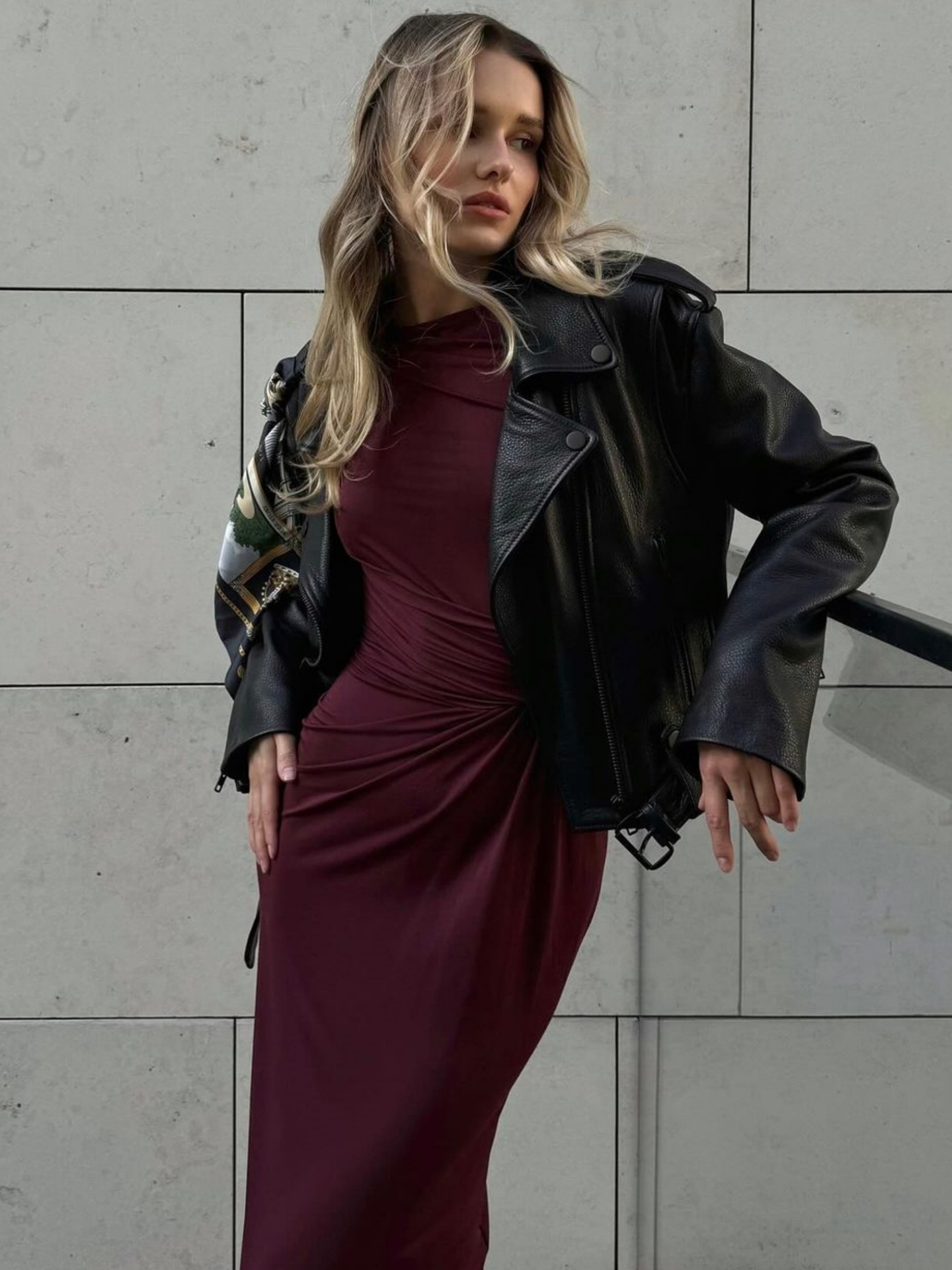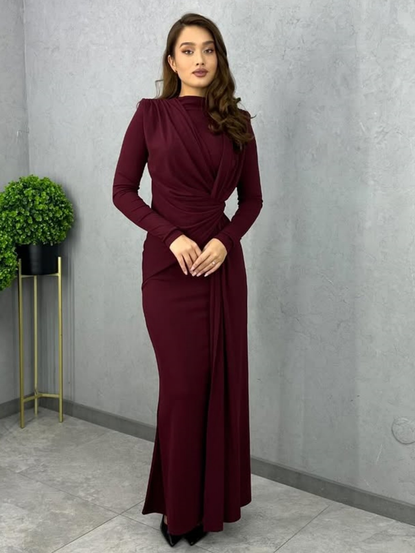 Long Sleeve Fitted Waist Pleated Slim-fit Long Dress